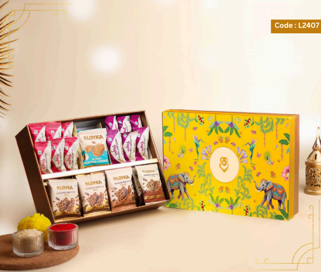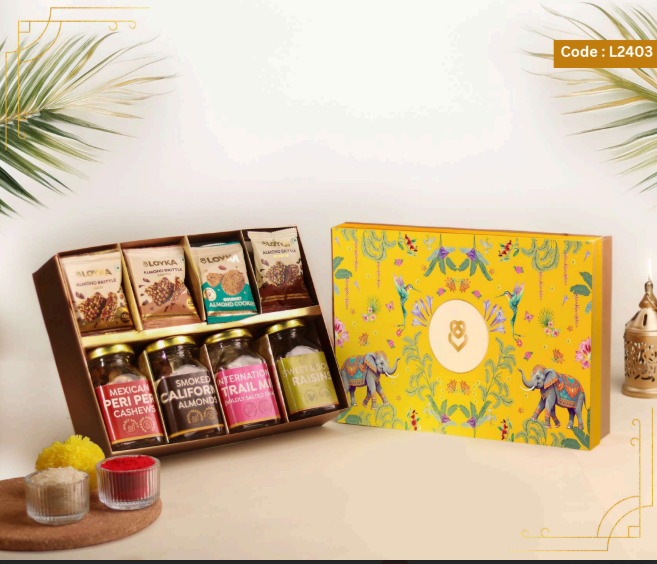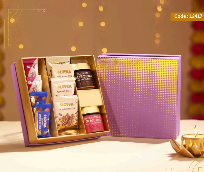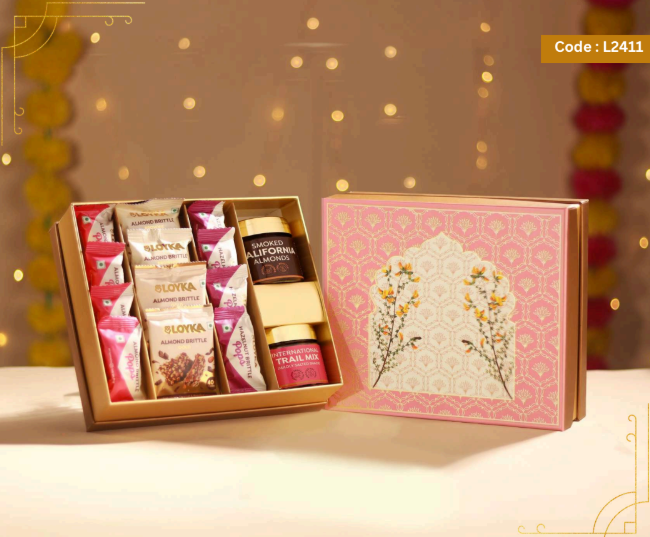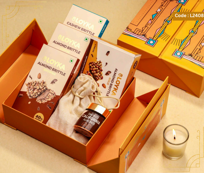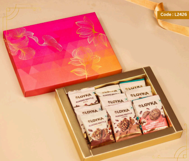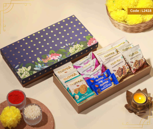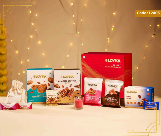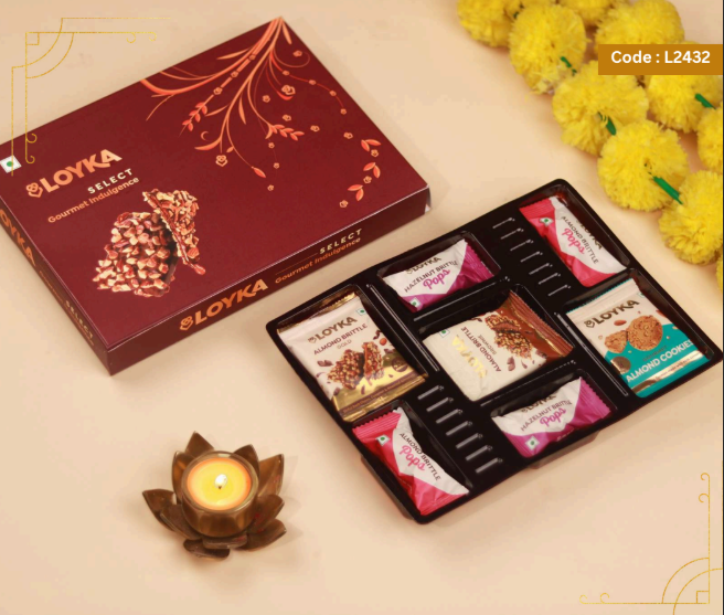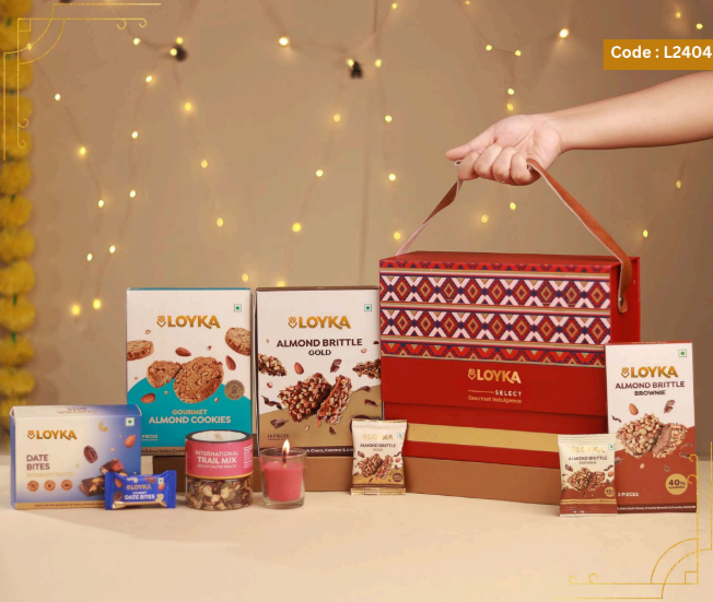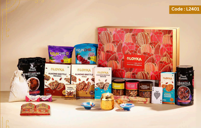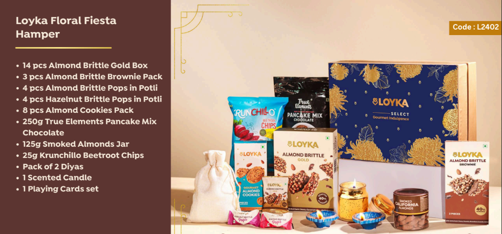 Loyka Floral Fiesta Hamper 14 pcs Almond Brittle Gold Box 3 pcs Almond Brittle Brownie Pack 4 pcs Almond Brittle Pops in Potli 4 pcs Hazelnut Brittle Pops in Potli 8 pcs Almond Cookies Pack 250g True Elements Pancake Mix Chocolate 125g Smoked Almonds Jar 25g Krunchillo Beetroot Chips Pack of 2 Diyas 1 Scented Candle 1 Playing Cards set